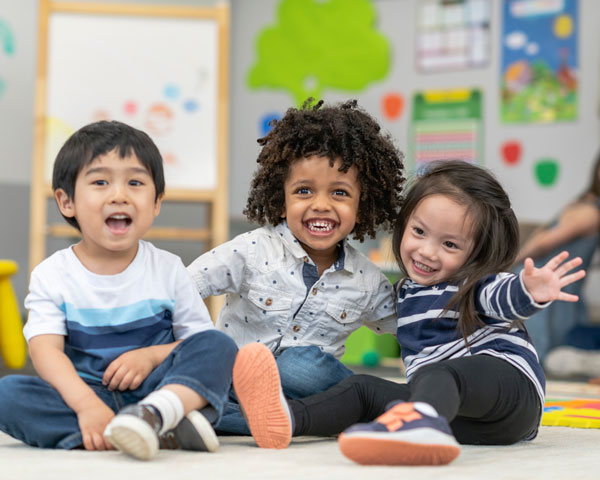 3 young children smile in a pre-k class